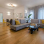 Richieste: L’ampio appartamento di circa 150 mq, dotato di un grande terrazzo panoramico, presentava un impianto costituito da due ampi quadrati separati da un corridoio centrale; la distribuzione avveniva attraverso un corridoio a forma di C, che da un lato serviva pranzo, soggiorno e zona servizi e dall'altro tre camere da letto ed un bagno. Impianti base. Completamente da ristrutturare. Il committente ha richiesto un ampio soggiorno ben collegato con il grande terrazzo di rappresentanza, tre camere da letto, due bagni, cucina, dispensa, lavanderia, implementazione con impianti moderni, cura del dettaglio. La Committenza aveva la necessità di poter lavorare in ambienti separati anche in smart working. Soluzioni: L’intervento ha sostanzialmente capovolto lo schema distributivo della zona giorno, realizzando un ampio soggiorno con accesso diretto al terrazzo, comunicante con la cucina attraverso un’ampia porta a vetri, con adiacente una zona servizi che include un terzo bagno ospiti; nell’altra ala, zona notte, riducendo lo spazio servente e razionalizzando lo schema distributivo, è stato possibile realizzare tre ampie camere e due bagni, di cui uno a servizio della camera padronale e l’altro con vasca su espressa richiesta della Committenza. Tutti i bagni sono dotati di finestra. Il corridoio di comunicazione delle due ali è stato attrezzato con una armadio per tutta la lunghezza e l’altezza e reso più armonico con il gioco di luci nel controsoffitto. Tutti gli impianti sono stati completamente rinnovati e implementati con un impianto di condizionamento. Ispirazioni e Concept: Insieme alla Committenza è stato fatto un approfondito lavoro di ricerca sui materiali da utilizzare per pavimenti e rivestimenti, render di studio con varie proposte di disegno dei rivestimenti, individuando soluzioni originali e ardite nel colore. Da notare il taglio del pavimento della cucina che si incastra con la superficie a parquet. Le porte della stessa serie, presentano intagli differenti che distinguono i vani. La libreria del soggiorno è stata realizzata su disegno (v. render) Le inferriate delle finestre sono state realizzate su disegno. Sono stati scelti arredi contemporanei, di preferenza della giovane coppia. Colori: Prevalenti sono i toni neutri, inserendo il colore solo nel rivestimento e pavimenti dei due bagni della zona notte. Marchi e brand utilizzati: Rivestimento: Ragno, Lea ceramiche, Marazzi Sanitari: Catalano Rubinetteria: Cucina: Veneta Cucine Arredo: Illuminazione: